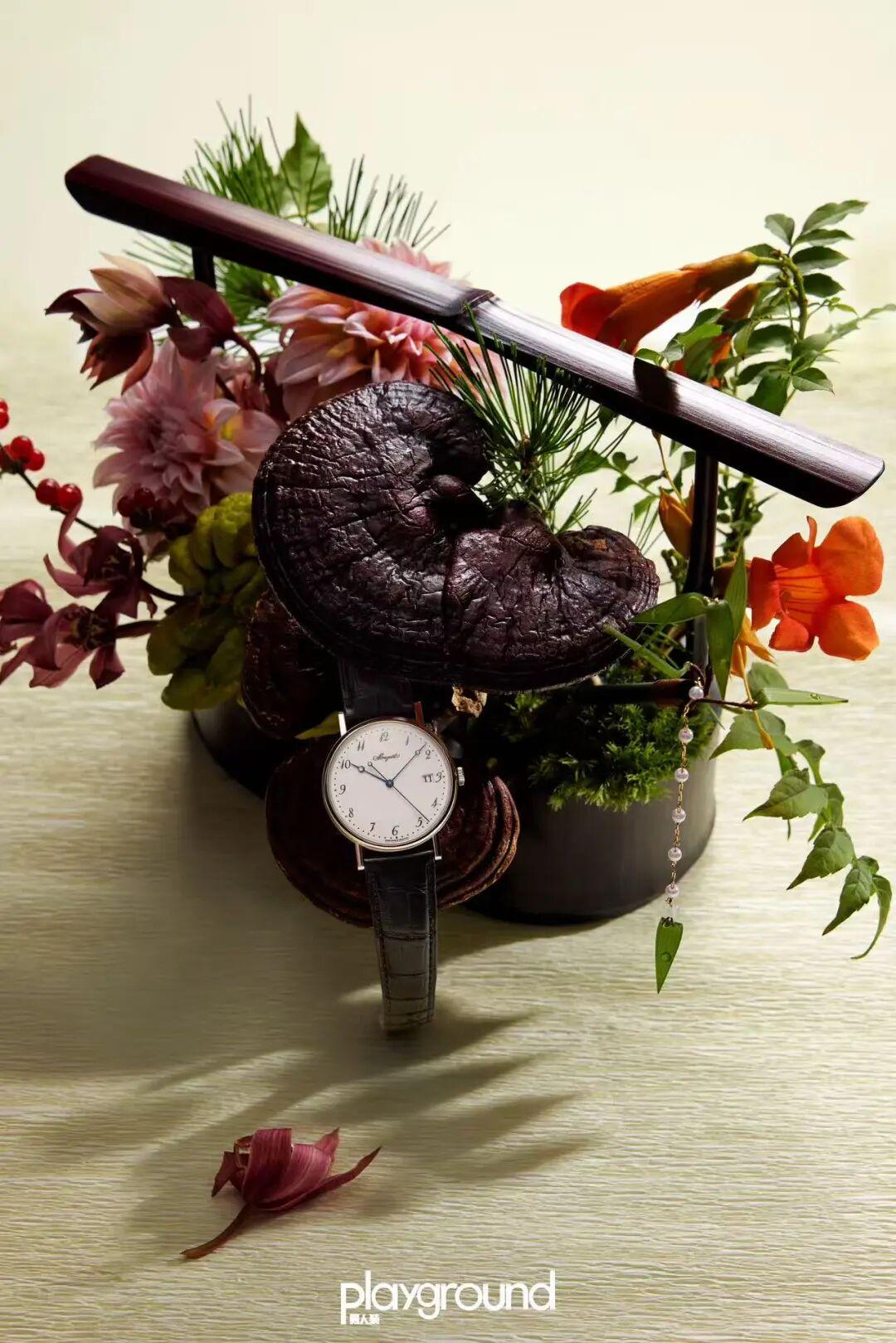 “芝,瑞草也,其形有类云霞,其色或紫或褐,味甘平,久服轻身不老。”《菌谱》寥寥数语,谈出灵芝的瑞气与传奇。宋风提篮里,灵芝插花姿态雍容,与Breguet宝玑Classique 经典系列5177手表相映成辉。松枝凝翠含烟,灵芝褐润生光。茶荚蕾果燃丹,佛手坠金映彩。它们相互点染,共绘一卷浓郁华好意思的景致。